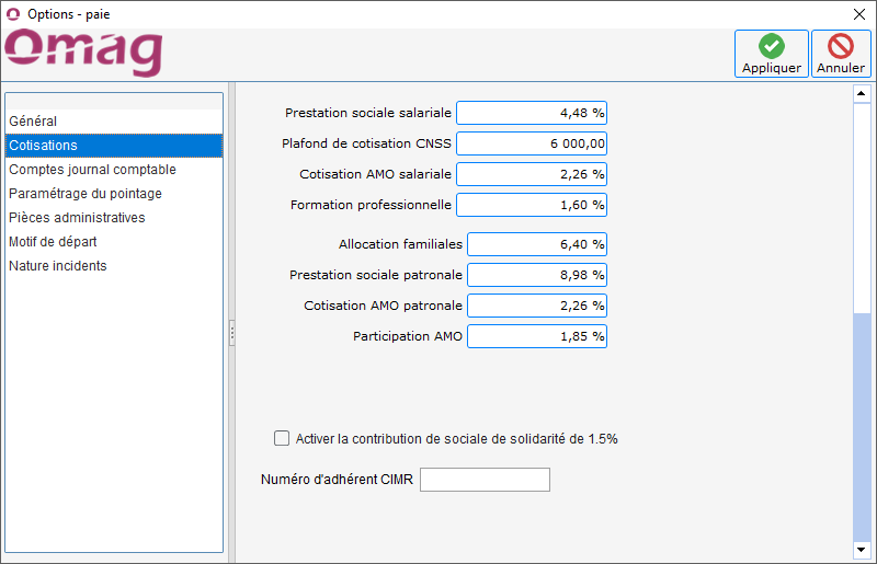 Configuration des taux de cotisations sociales et patronales selon la législation marocaine.