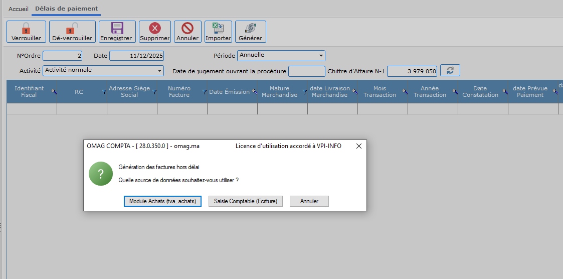 Pour crée une déclaration de délais de paiement clique crée puis sélectionner la période que vous voulez générer ou bien remplir les information manuelle puis verrouiller .