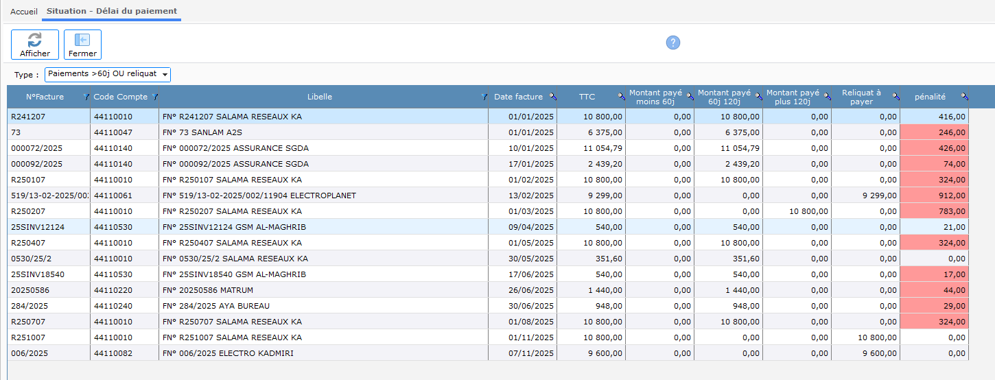 - Montant total des factures non payées dans les délais